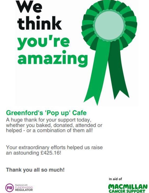 - We've organised and ran 'pop up' community cafes, which raised an amazing £926.28 for MacMillan Cancer support, so far!